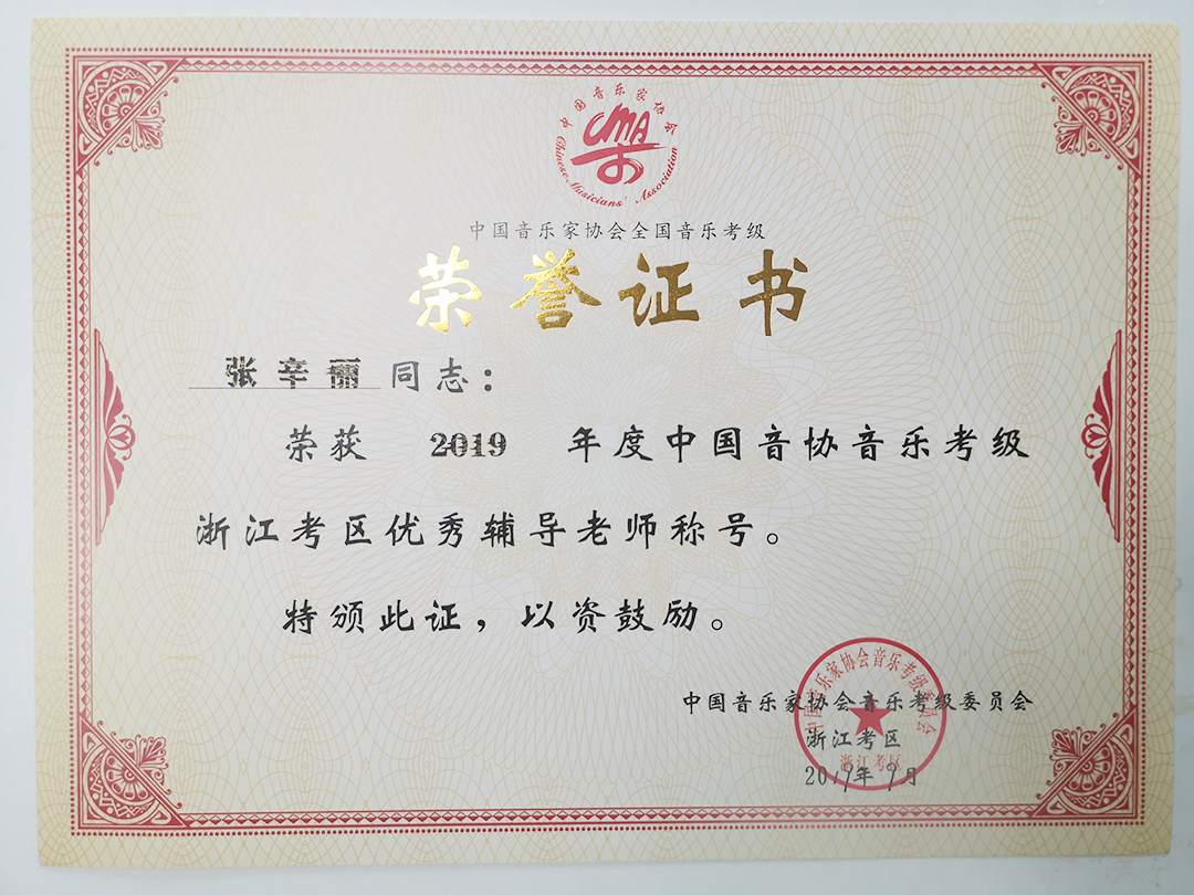“2019年度中国音协音乐考级浙江考区优秀辅导教师”